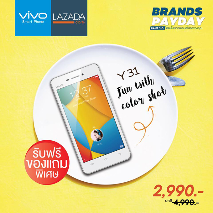 มีมาเรื่อยๆ สำหรับโปรโมชั่นจาก ลาซาด้า ล่าสุดมาในแคมเปญ Brands Payday ลดกันสุดๆ ไปเลยสำหรับสมาร์ทโฟนจาก Vivo รุ่น Y31 ตัวเล็กสเปคแรง จากราคา 4,990 บาท ลดเหลือเพียง 2,990 บาทเท่านั้น พร้อมของแถมอีกมากมาย ไม่หมดเพียงแค่นี้ ยังโปรโมชั่นสำหรับสมาร์ทโฟนรุ่นอื่นๆ อีกเพียบ ตั้งแต่วันนี้ ถึง 27 กรกฎาคม 2560 ที่ LAZADA ร้าน VivoThailand