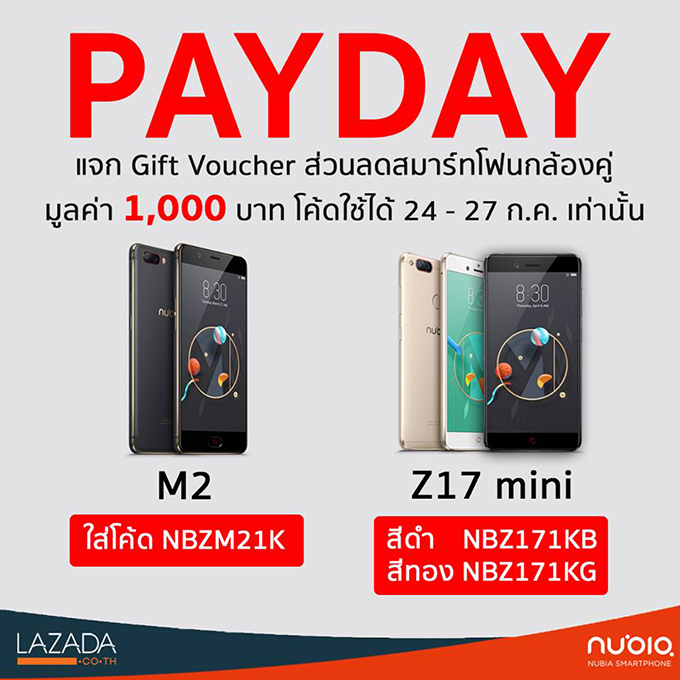 นูเบีย จัดโปรโมชั่นสุดพิเศษบนลาซาด้า ช้อปสบายกระเป๋ากับแคมเปญ Lazada Payday พร้อมมอบส่วนลดพิเศษถึง 1,000 บาท สำหรับสมาร์ทโฟนกล้องคู่สองรุ่นยอดนิยม Nubia Z17 mini (ราคาปกติ 9,990 บาท) และ Nubia M2 (ราคาปกติ 10,990 บาท)