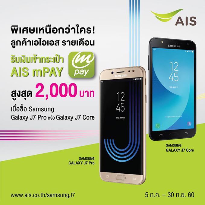 พิเศษเหนือกว่าใคร! สำหรับลูกค้า เอไอเอส รายเดือน รับเงินเข้ากระเป๋า AIS mPAY สูงสุด 2,000 บาท เมื่อซื้อสมาร์ทโฟน Samsung Galaxy J7 Pro หรือ Samsung Galaxy J7 Core ตั้งแต่วันนี้ - 30 ก.ย. 2560