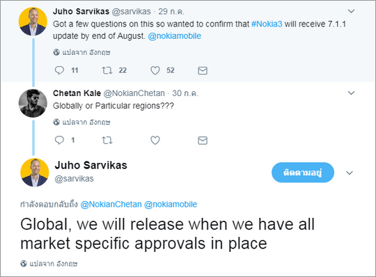 นอกจากนี้ ทาง Juho Sarvikas ยืนยันเองด้วยว่าจะสามารถอัพเดตได้ทั่วโลกเลยนะครับ สบายใจได้เลย Nokia 3 ของเพื่อนๆ จะได้รับการอัพเดต Android 7.1.1 Nougat อย่างแน่นอน เผลอๆ อาจจะรับการอัพเดต Android O ต่อไปในอนาคตอีกด้วย