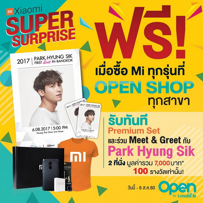 Xiaomi Super Surprise สุดคุ้ม! เมื่อซื้อสมาร์ทโฟน Xiaomi Mi รุ่นใดก็ได้ รับฟรี บัตร Meet & Greet "พัคฮยองชิก" (Park Hyung Sik) จำนวน 2 ที่นั่ง มูลค่า 7,000 บาท (ราคาบัตรใบละ 3,500 บาท) โดยงานดังกล่าวเป็นงานแฟนมีตติ้งครั้งแรกในประเทศไทยของ พัคฮยองชิก ในชื่อว่า "2017 Park Hyung Sik First Love in Bangkok" ที่มีขึ้นขึ้นในวันที่ 6 สิงหาคม 2560 เวลา 17.00น. ณ GMM Live House @ Central World