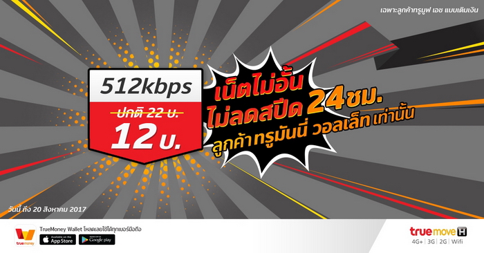TrueMove H ต้อนรับวันแม่กับแพ็กเน็ตในราคาสุดพิเศษ แพ็คเกจ 512Kbps เน็ตไม่อั้น ไม่ลดสปีด 24 ชม. เพียง 12 บาท (จากปกติ 22 บาท) โดยต้องซื้อผ่านแอปพลิเคชั่น TrueMoney Wallet เท่านั้น (ถึงจะได้ราคานี้)
