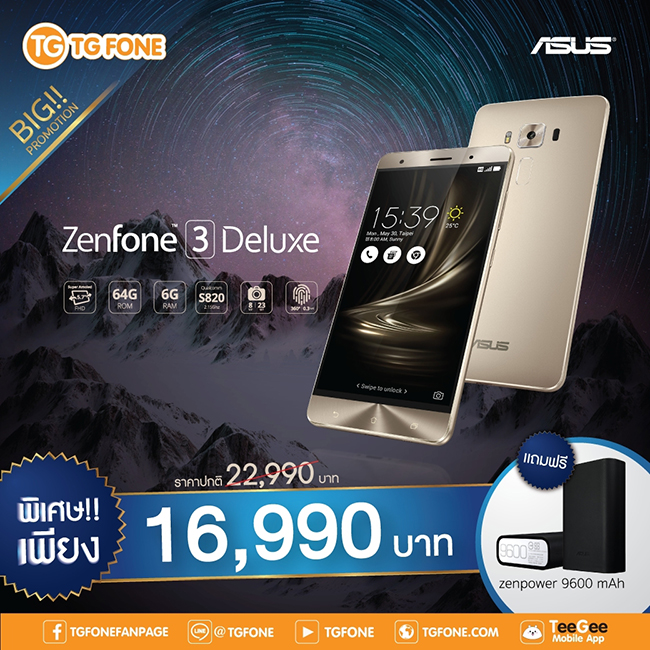 สมาร์ทโฟน ASUS Zenfone 3 Deluxe มาพร้อมชิปเซ็ต Snapdragon 820 กล้องความละเอียดถึง 23 ล้านพิกเซล รองรับการถ่ายวีดีโอ 4K ระบบโฟกัสจัดเต็ม ให้คุณเป็นเจ้าของได้แล้ววันนี้ ในราคาพิเศษเพียง 16,990 บาท (จากราคาปกติ 22,990 บาท) และรับฟรี Zenpower 9600 mAh พร้อมโปรโมชั่นบัตรเครดิต และของแถมอื่นๆ อีกมากมายที่ TG FONE ทุกสาขาทั่วประเทศ