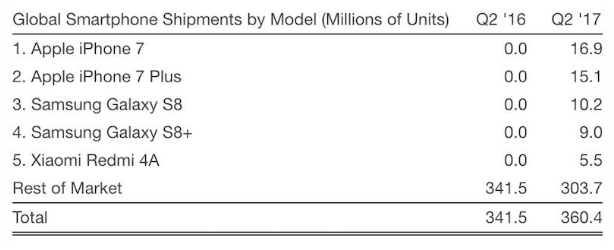 ส่วนอันดับอื่น ๆ ตามมาด้วย Samsung อย่าง Samsung Galaxy S8 และ Samsung Galaxy S8+ ซึ่งจัดส่งไปได้ 10.2 ล้านเครื่อง และ 9 ล้านเครื่องตามลำดับ โดยเริ่มวางจำหน่ายไปเมื่อเดือนเมษายนที่ผ่านมา ในขณะที่อันดับ 5 ได้แก่สมาร์ทโฟนราคาเบาๆ Xiaomi Redmi 4A ที่มียอดจัดส่ง 5.5 ล้านเครื่อง สำหรับภาพรวมในไตรมาสที่ 2 นี้มีสมาร์ทโฟนทั้งหมด วางขายไปได้มากถึง 360.4 ล้านเครื่องเลยทีเดียว