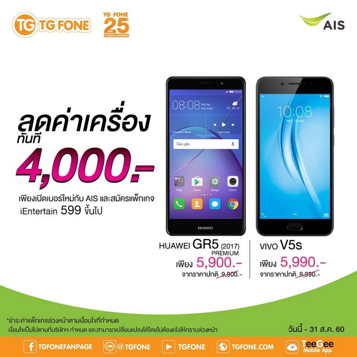 TG FONE จัดโปร Huawei GR5 (2017) Premium หรือ Vivo V5s ลดทันที 4,000.- เมื่อเปิดเบอร์ใหม่ AIS