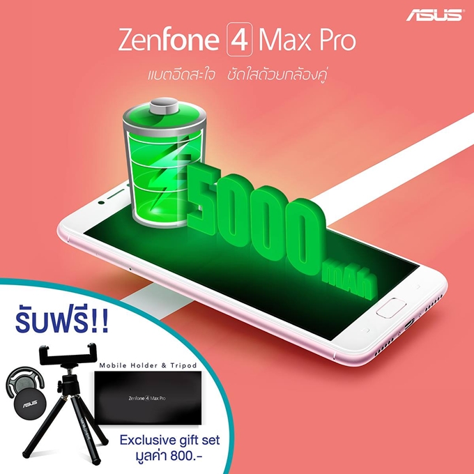 พิเศษ! ซื้อ Asus Zenfone 4 Max Pro วันนี้ รับฟรี! ชุด Exclusive gift set มูลค่า 800 บาท แต่ต้องรีบหน่อย เพราะของแถมมีจำนวนจำกัด สอบถามข้อมูลเพิ่มเติมได้ที่ร้านค้าตัวแทนจำหน่ายทุกสาขา