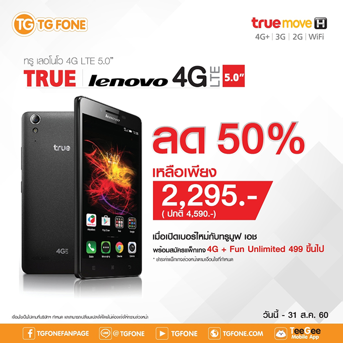 ทรูมูฟ เอช จัดโปรโมชั่นดีๆ ที่ไม่ควรพลาด! เพียงเปิดเบอร์ใหม่พร้อมสมัครแพ็กเกจ 4G+ Fun Unlimited 499 ขึ้นไป รับส่วนลดค่าเครื่องทันที 50% กับสมาร์ทโฟน True Lenovo 4G LTE 5.0 ในราคาเบาๆ เพียง 2,295 บาท เฉพาะที่ TG FONE เท่านั้น!