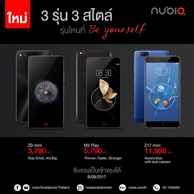 Nubia แบรนด์สมาร์ทโฟนที่กำลังมาแรงในประเทศไทย จุดเด่นอยู่ที่ตัวสมาร์ทโฟนคุณภาพดีและมีลูกเล่นอันโดดเด่น ทั้งในส่วนของฟีเจอร์หรือกล้อง แถมในแต่ละรุ่นมีราคาที่จับต้องได้ง่าย ล่าสุด นูเบีย ประเทศไทย เตรียมวางจำหน่ายสมาร์ทโฟนอีก 3 รุ่น ประกอบด้วย Nubia Z9 Mini, Nubia M2 Play และ Nubia Z17 Mini สีฟ้า Aurora Blue ในวันที่ 9 ก.ย. 60 ผ่านทุกช่องทางการจัดจำหน่าย และ store.nubia