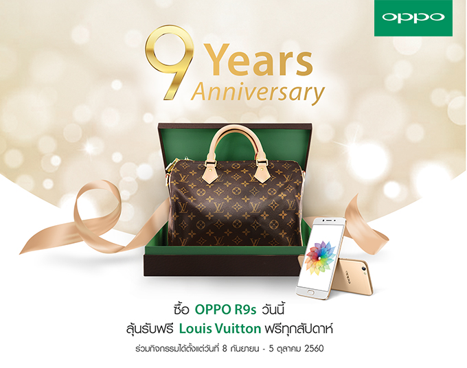 ออปโป้ ฉลองครบรอบ 9 ปีอย่างยิ่งใหญ่ กับกิจกรรม OPPO 9th Year Anniversary ให้คุณมีสิทธิ์ลุ้นเป็นเจ้าของกระเป๋า Louis Vuitton ฟรีทุกสัปดาห์ ง่ายๆ เพียงซื้อ OPPO R9s ตั้งแต่วันที่ 8 กันยายน - 5 ตุลาคม 2560 นี้ ก็มีสิทธิ์ลุ้นเป็นเจ้าของกระเป๋า Louis Vuitton สุดหรูได้เลยทันที