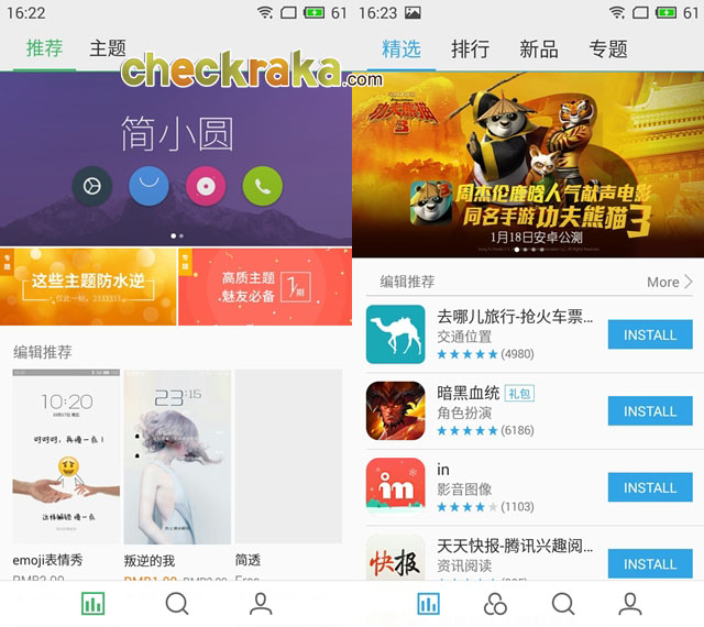 เช่นเดียวกับ Meizu m2 note เครื่องมาพร้อม App Center ของตัวเอง (อยู่ในแอปฯ Personalize) ซึ่งคุณสามารถดาวน์โหลดแอปฯ หรือธีมเพิ่มเติมได้จากที่นี่ ซึ่งคอนเทนต์ต่างๆ ก็ยังรองรับได้แค่ภาษาจีนเท่านั้น