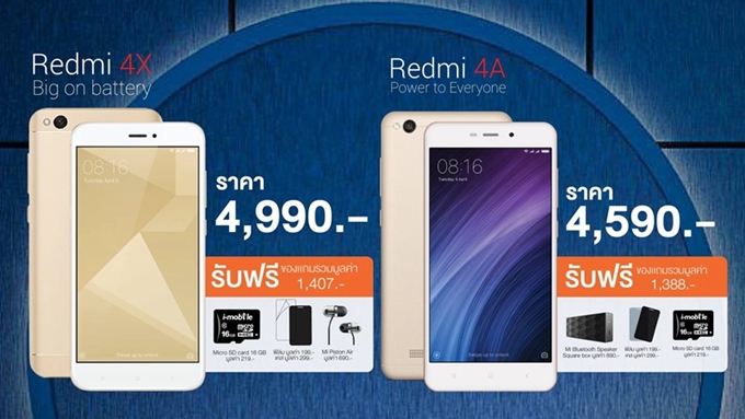 Xiaomi Redmi 4A ราคาวางจำหน่ายอยู่ที่ 4,590 บาท หากซื้อภายในงาน Thailand Mobile Expo 2017 จะได้รับ Mi Bluetooth Speaker / microSD card 16GB / ฟิล์มกันรอย และเคส ส่วน Xiaomi Redmi 4X ราคาวางจำหน่ายอยู่ที่ 4,990 บาท หากซื้อภายในงาน Thailand Mobile Expo 2017 จะมีของแถม 4 อย่างได้แก่ Mi Piston Air / microSD card 16GB / ฟิล์มกันรอย และเคส สำหรับใครที่สนใจก็ต้องรีบๆ หน่อยนะคะ