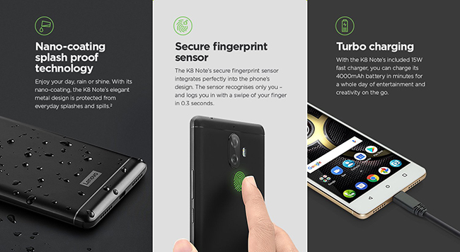 Lenovo K8 Note มาพร้อมหน้าจอ IPS LCD ขนาด 5.5 นิ้ว ความละเอียด Full HD ขอบโค้ง 2.5D Gorilla Glass ตัวเครื่องผลิตจากโลหะ (Metal Body) พร้อมความโค้งมนที่ด้านหลังเพื่อการจับถือที่ถนัดมือ ใช้หน่วยประมวลผล MediaTek 10-core Helio X23 ซึ่งรุ่นนี้จะมาพร้อมกับรุ่นย่อย 2 รุ่น นั่นก็คือ รุ่น RAM 3GB / ROM 32GB และรุ่น RAM 4GB / ROM 64GB รองรับการ์ดหน่วยความจำภายนอกแบบ microSD ความจุสูงสุด 128GB