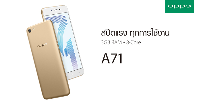 OPPO A71 รองรับ 4G LTE, ดีไซน์เรียบหรู และงานประกอบไร้รอยต่อ Unibody วัสดุผลิตมาจากพลาสติก เคลือบผิวแบบนาโนซิลเวอร์ดูสวยงามกว่าที่เคย มีความบางเพียง 7.6 มม. เท่านั้น หน้าจอ TFT ขนาด 5.2 นิ้ว ความละเอียด HD 720P, ชิปเซ็ต Mediatek MT6750, CPU Octa-Core 1.5 GHz, GPU Mali-T860 MP2, RAM 3GB, หน่วยความจำ 16GB (รองรับ MicroSD), แบตเตอรี่ความจุ 3,000 mAh
