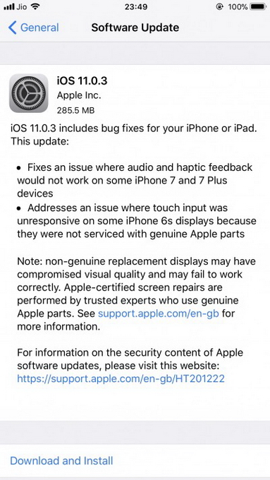 Apple ปล่อยอัพเดต iOS 11.0.3 แก้ปัญหาหน้าจอสำหรับ iPhone และ iPad ทัชไม่ติดออกมาแล้วนะครับ โดยจะมีขนาดไฟล์อัพเดต 285MB ถือว่าปล่อยอัพเดตแก้ไขออกมาเร็วมากๆ หลังจากที่เพิ่งจะปล่อย iOS 11.0.2 ออกมาเมื่อสัปดาห์ที่ผ่านมานี้เอง โดยเป็นการปรับปรุงแก้ไขใน 2 จุดหลักๆ ได้แก่