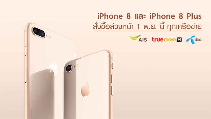 ทั้ง 3 เครือข่ายยักษ์ใหญ่ของไทย AIS, TrueMove H และ dtac เตรียมเปิดให้สั่งจองล่วงหน้าสมาร์ทโฟนที่กระแสดีที่สุดในตอนนี้ iPhone 8 และ iPhone 8 Plus ในวันที่ 1 พ.ย. 60 นี้ เป็นต้นไป ใครที่สนใจห้ามพลาดครับ แน่นอนว่าจะต้องมาพร้อมกับโปรโมชั่นสุดพิเศษของแต่ละเครือข่ายอย่างแน่นอน และจะวางจำหน่ายอย่างเป็นทางการในประเทศไทยวันที่ 3 พ.ย. 60 นี้ครับ