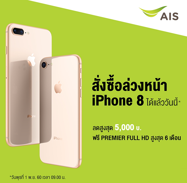 เอไอเอส ประกาศวางจำหน่าย iPhone 8 และ iPhone 8 Plus อย่างเป็นทางการเรียบร้อยแล้ว พร้อมรับส่วนลดสูงสุด 5,000 บาท เมื่อแพ็กเกจ 4G Hot Deal Non-Stop สำหรับใครที่สนใจสามารถสั่งจองได้ในวันที่ 1 พฤศจิกายน 2560 ผ่านทางเว็บไซต์ www.ais.co.th/iphone8 และจะวางจำหน่ายที่เอไอเอส ช็อป ทุกสาขา, ร้านเทเลวิซที่ร่วมรายการทั่วประเทศ, ร้าน iStudio และ AIS Online Store ในวันที่ 3 พฤศจิกายน 2560 เป็นต้นไป