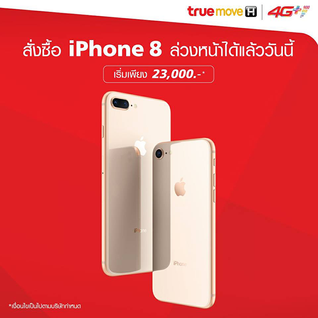 ลูกค้า ทรูมูฟ เอช สามารถสั่งซื้อ iPhone 8 และ iPhone 8 Plus ได้แล้ววันนี้ั ผ่านทาง www.truemoveh.com/iPhone8/Pre-order พร้อมรับส่วนลดสูงสุด 6,000 บาท เมื่อซื้อพร้อมสมัครแพ็คเกจ 4G+ FUN Unlimited 1,299 - 1,899 และชำระค่าบริการล่วงหน้า 4,000 บาท (สัญญา 9 เดือน)