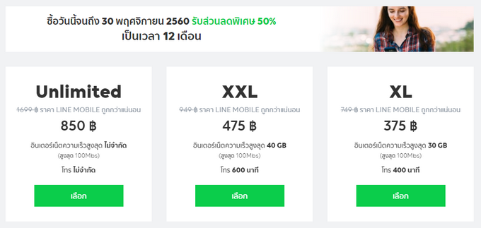 Line Mobile บริการโทรศัพท์มือถือใหม่ในรูปแบบดิจิทัล ขยายเวลาโปรโมชั่นลด 50% ทุกแพ็กเกจ นาน 12 รอบบิล จนถึง 30 พฤศจิกายน 60 เพียงซื้อซิม Line Mobile ครอบคลุมทั้ง 7 แพ็กเกจออกแบบมาเพื่อรองรับทุกรูปแบบการใช้งาน พร้อมราคาที่ให้ผู้ใช้งานจ่ายถูกกว่าในทุกแพ็กเกจ ตั้งแต่ไซส์ XS, S, M, L, XL, XXL, และ Unlimited ในราคาสุดพิเศษ เริ่มต้นเพียง 125 บาท!