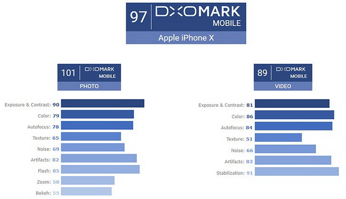สมาร์ทโฟนที่ร้อนแรงที่สุดในตอนนี้ก็หนีไม่พ้น iPhone X จากค่าย Apple เป็นสมาร์ทโฟนที่ได้รับคะแนนทดสอบเป็นอันดับ 1 ในเรื่องภาพนิ่งจาก DxOMark ได้คะแนนสูงกว่าคู่แข่งอย่างอย่างน่าตกใจ ทำคะแนนไปได้ถึง 101 คะแนน แต่คะแนนวีดีโออยู่ที่ 89 คะแนน ทำให้คะแนนรวมออกมาอยู่ที่ 97 คะแนน เทียบเท่า Huawei Mate 10 Pro และ Samsung Galaxy Note 8