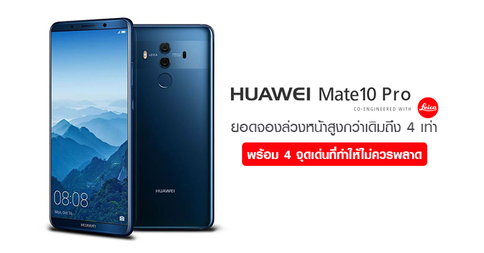 Huawei Mate 10 Pro สมาร์ทโฟนเรือธงรุ่นใหม่ ที่มาพร้อมจุดเด่นมากมาย แถมกล้องคู่จาก Leica ที่พัฒนาคุณภาพให้สูงขึ้นแบบก้าวกระโดด เปิดจองล่วงหน้าตั้งแต่วันที่ 18 - 26 พ.ย. 60 ล่าสุดได้รับการตอบรับอย่างล้นหลาม โดยสามารถกวาดยอดจองในช่วง 3 วันแรกมากกว่ารุ่นก่อนถึง 4 เท่าตัวเลยทีเดียว!