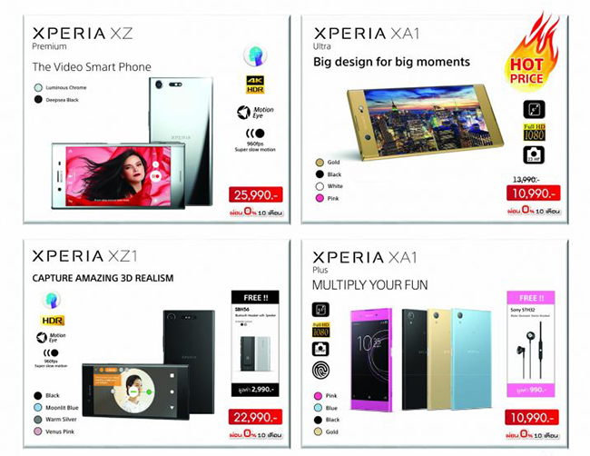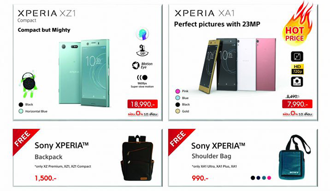 สำหรับลูกค้าที่ซื้อสมาร์ทโฟน XperiaTM XZ series (ทั้ง XZ Premium, XZ1 และ XZ1 Compact) รับฟรี กระเป๋าเป้ของแท้จากโซนี่มูลค่า 1,500 บาท และลูกค้า XperiaTM XA series (XA1 Ultra, XA1 Plus และ XA1) รับฟรี กระเป๋าสะพายข้างสุดเก๋จากโซนี่ มูลค่า 990 บาท