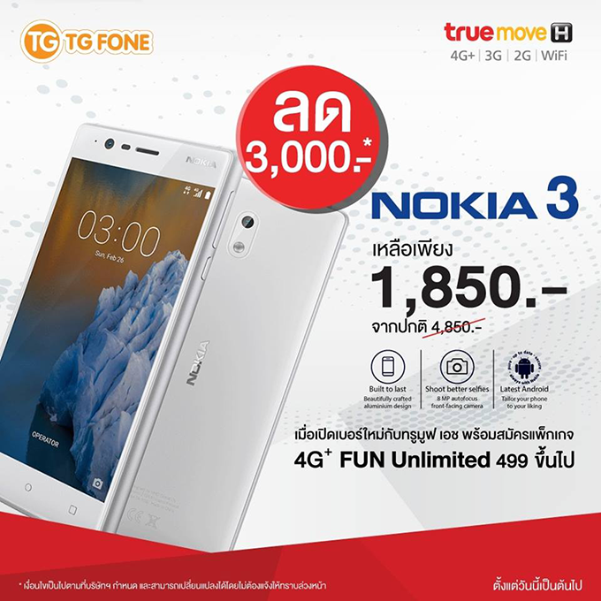 คุ้มสุด ๆ เมื่อซื้อสมาร์ทโฟน Nokia 3 ที่ร้านทีจีโฟน รับส่วนลดค่าเครื่อง 3,000 บาท เหลือเพียง 1,850 บาท (จากปกติราคา 4,850 บาท) เพียงซื้อเครื่องพร้อมเปิดเบอร์ใหม่กับ ทรูมูฟ เอชและสมัครแพ็กเกจ 4G+ Fun Unlimited 499 ขึ้นไป