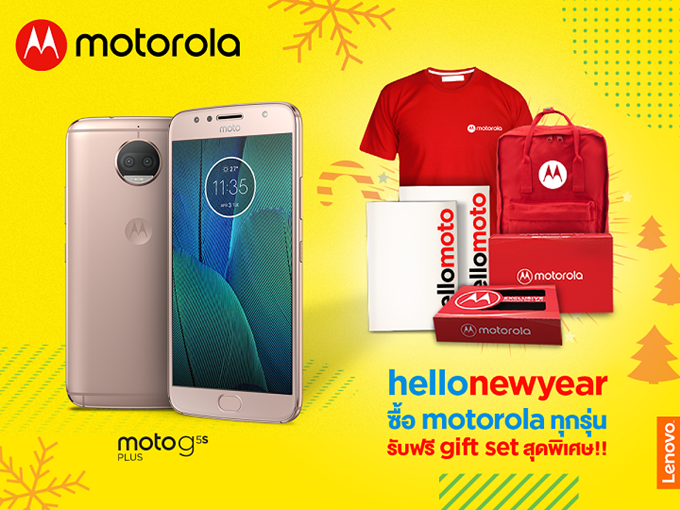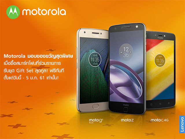 โมโตโรล่า ร่วมเฉลิมฉลองเทศกาลส่งท้ายปีเก่า ต้อนรับปีใหม่ มอบของขวัญสุดพิเศษตอบแทนลูกค้าโมโตโรล่า เมื่อซื้อสมาร์ทโฟนที่ร่วมรายการ รับชุด Gift Set สุดคูล! ฟรีทันที ตั้งแต่วันนี้ - 5 มกราคม 2561 นี้เท่านั้น!
