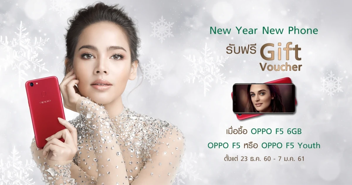 ใกล้สิ้นปีแบบนี้ สำหรับใครที่กำลังมองหาของขวัญสุดพิเศษหรือมีแพลนจะเปลี่ยนโทรศัพท์เครื่องใหม่ ออปโป้ ก็กลับมาอีกครั้งกับกิจกรรมดีๆ ให้คุณลูกค้าคนสำคัญทุกท่านกับ "OPPO New Year New Phone" ขอมอบบัตรของขวัญใช้แทนเงินสดมูลค่าสูงสุดกว่า 500 บาท ง่ายๆ เพียงซื้อสมาร์ทโฟนในรุ่น OPPO F5 Series ตั้งแต่วันที่ 23 ธันวาคม 2560 - 7 มกราคม 2561 ก็มีสิทธิ์จับบัตรของขวัญใช้แทนเงินสดกันไปเลย (เฉพาะร้านที่ร่วมรายการ)