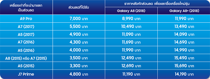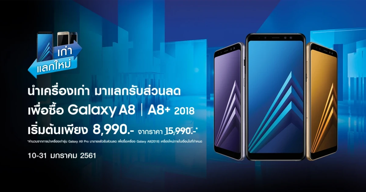 Samsung Galaxy A8 (2018) และ Samsung Galaxy A8+ (2018) สมาร์ทโฟนหน้าจอไร้ขอบ กล้องหน้าคู่รุ่นแรกของ ซัมซุง วางจำหน่ายอย่างเป็นทางการ พร้อมโปรโมชั่นน่าสนใจ "นำเครื่องเก่า มาแลกรับส่วนลดซื้อเครื่องใหม่ เริ่มต้นเพียง 8,990 บาทเท่านั้น" ตั้งแต่วันนี้ - 31 ม.ค. 2561 โดยเครื่องเก่าที่สามารถนำมาแลกเป็นส่วนลด มีดังนี้