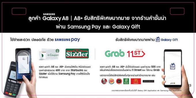 Samsung Galaxy A8 (2018) และ Samsung Galaxy A8+ (2018) มาพร้อมดีไซน์โลหะและกระจก หน้าจอ Super AMOLED อัตราส่วน 18.5:9 ไร้ขอบ ความละเอียด Full HD+ รองรับ Always-on display รองรับมาตรฐานกันน้ำ และฝุ่นระดับ IP68 และรองรับ Samsung Pay กล้องหน้าคู่ โดยมีความละเอียด 16MP (F1.9) + 8MP (F1.9) และกล้องหลังความละเอียด 16MP (F1.7) รองรับ PDAF วางจำหน่าย 3 สี ได้แก่ Gold, Black และ Orchid Gray ในราคา 15,990 บาท และ 18,990 บาท ตามลำดับ นอกจากนี้ มาพร้อม Welcome Pack มูลค่ารวมกว่า 1,000 บาท เพื่อใช้เป็นส่วนลดร้านค้าชั้นนำ ผ่านทาง Galaxy Gift และ Samsung Pay แถมยังได้รับส่วนลดการใช้บริการ หรือซื้อสินค้าผ่าน Grab, 11-street, Starbuck และ Sizzler