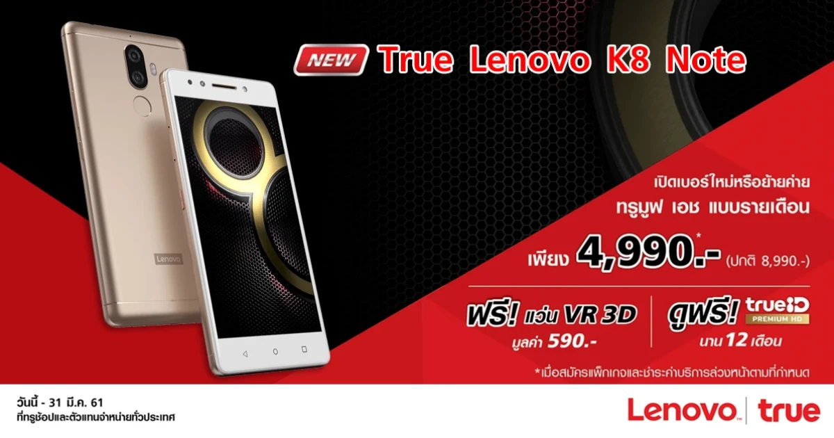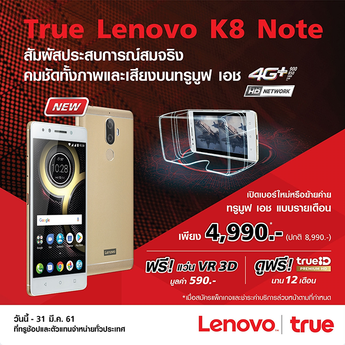 สิทธิพิเศษสำหรับลูกค้า ทรูมูฟ เอช แบบรายเดือน สามารถเป็นเจ้าของสมาร์ทโฟน Lenovo K8 Note ในราคาสุดคุ้มเพียง 4,990 บาท (จากปกติ 8,990 บาท) เมื่อจ่ายค่าบริการล่วงหน้า 1,500 บาท พร้อมสมัครแพ็คเกจ 4G+ Fun Unlimited 499 บาทขึ้นไป สัญญา 12 เดือน เท่านั้นไม่พอ รับฟรี แว่น VR 3D มูลค่า 590 บาท และดูฟรี True ID Premium HD นาน 12 เดือน
