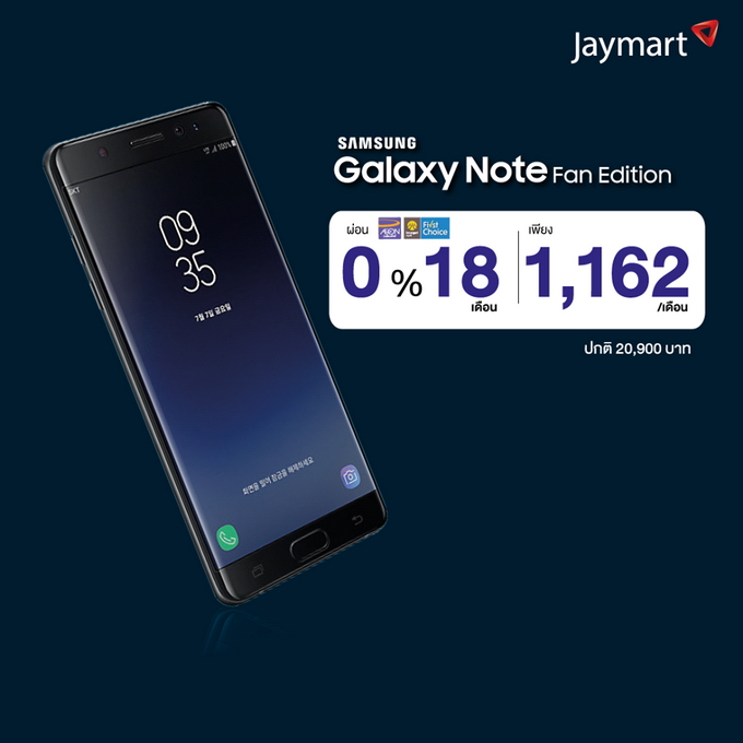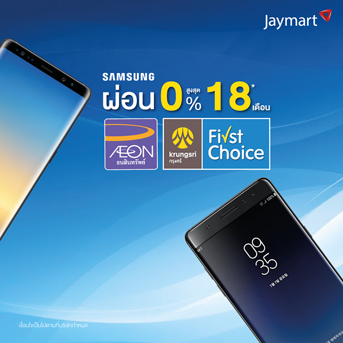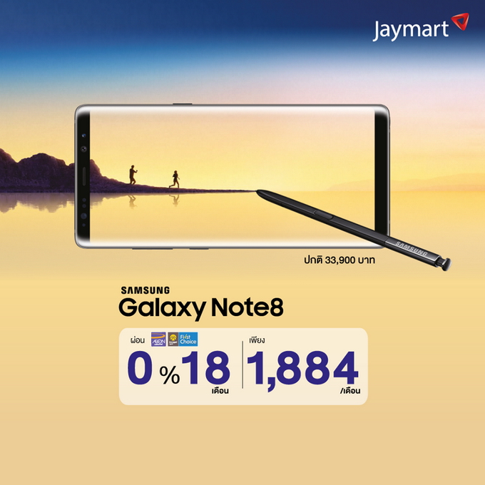 Jaymart จัดโปรโมชั่นกับคู่หูสมาร์ทโฟนกระแสแรงจาก ซัมซุง ที่มาพร้อมการใช้งานระดับมืออาชีพ Samsung Galaxy Note 8 และ Samsung Galaxy Note Fan Edition เอาใจคนชอบผ่อนสบายๆ 0% นานสูงสุด 18 เดือน กับบัตรเครดิต Aeon และ Krungsri First Choice พร้อมฟรี! ประกันหน้าจอแตกนาน 6 เดือน (เมื่อสมัคร Enjoy Card) ตั้งแต่วันนี้ - 31 ม.ค. 2561 ที่ Jaymart ทุกสาขาทั่วประเทศ