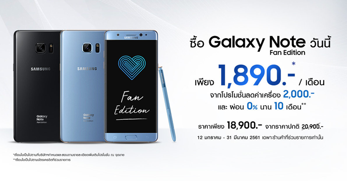 ซัมซุง จัดโปรโมชั่นพิเศษ เอาใจคนกำลังมองหาสมาร์ทโฟน ซื้อ Samsung Galaxy Note Fan Edition วันนี้ ในราคาพิเศษ เพียง 18,900 บาท (จากราคาปกติ 20,900 บาท) พร้อมรับสิทธิผ่อนสบาย 0% นาน 10 เดือน กับบัตรเครดิตที่ร่วมรายการ เพียงเดือน 1,890 บาท (จากโปรโมชั่นลดค่าเครื่อง 2,000 บาท)