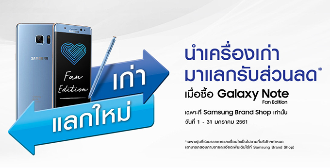เท่านั้นยังไม่พอ สามารถนำสมาร์ทโฟนเครื่องเก่า มาแลกรับส่วนลด เมื่อซื้อ Samsung Galaxy Note Fan Edition เฉพาะที่ Samung Brand Shop เท่านั้น ตั้งแต่วันนี้ - 31 มกราคม 2561