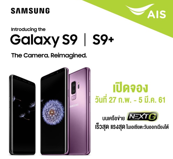 เอไอเอส จับมือ ซัมซุง ประกาศเปิดให้จอง Samsung Galaxy S9 และ Samsung Galaxy S9+ สมาร์ทโฟนเรือธงรุ่นล่าสุดที่มาพร้อมความมหัศจรรย์จากกล้องที่ฉลาดเหมือนดวงตามนุษย์ ด้วยรูรับแสงคู่ที่สามารถเลือกปรับตามสภาพแสงได้ ลำโพงสเตอริโอด้วยระบบเสียง Dolby Atmos พร้อมฟีเจอร์อีกเพียบ ที่ล้ำที่สุดในมือถือตระกูลเอส ซีรีย์ พร้อมรองรับ AIS NEXT G NETWORK เครือข่ายความเร็วระดับกิกะบิท ที่เร็ว แรง ที่สุดในไทย และเอเชียตะวันออกเฉียงใต้ พร้อมจัดเต็ม! ข้อเสนอสุดพิเศษ เฉพาะลูกค้าเอไอเอส ทั้งลูกค้าปัจจุบัน, เปิดเบอร์ใหม่ หรือเปลี่ยนจากเติมเงินเป็นรายเดือน