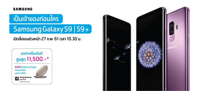 - สั่งจอง Galaxy S9 และ S9+ ในทุกช่องทาง ช่วงวันที่ 27 กุมภาพันธ์ ถึงวันที่ 5 มีนาคม จะได้รับ Wireless Charger Convertible มูลค่า 2,090 บาท โดยจะได้รับของแถมพร้อมกับตอนรับเครื่องช่วงวันที่ 9-11 มีนาคม (ส่วน S9+ รุ่น 256GB จะได้รับพร้อมเครื่อง ช่วงวันที่ 29-31 มีนาคม