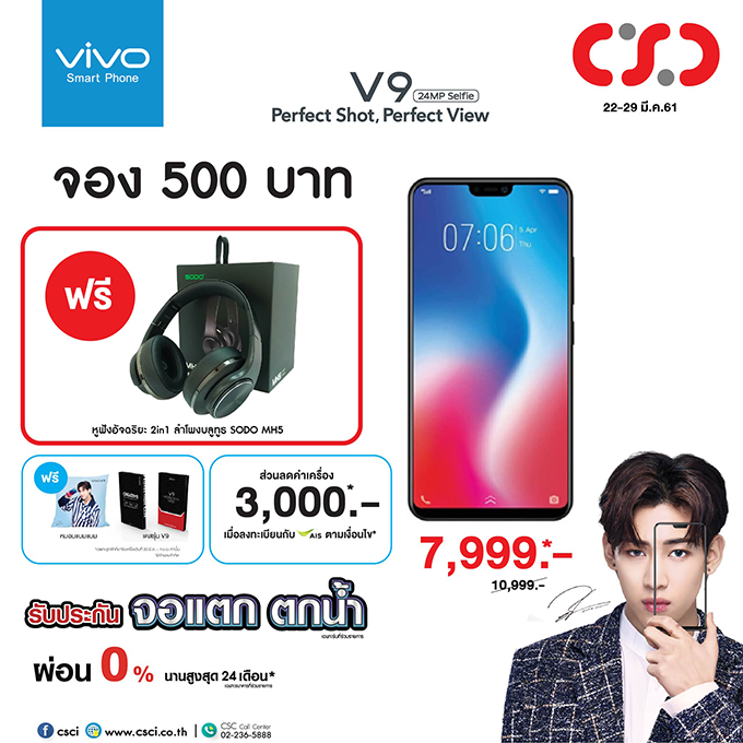 สั่งจอง Vivo V9 กับ CSC วันนี้ ผ่อนสบาย 0% นาน 24 เดือน พร้อมลุ้นรับฟรีอีก 1 เครื่อง!