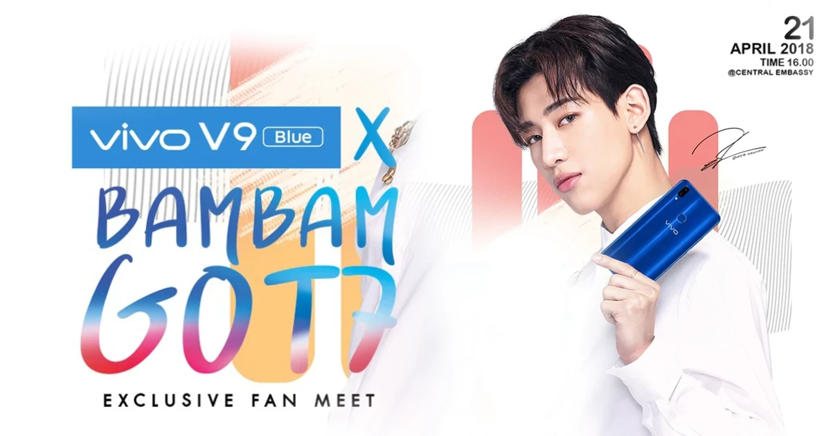 สำหรับกิจกรรมที่จะจัดขึ้นมีชื่อว่า Vivo V9 x BAMBAM GOT7 Exclusive Fan Meet ในวันเสาร์ที่ 21 เมษายน 2561 ณ Central Embassy Space ชั้น G เวลา 16.00 น. มาพร้อมกับการเปิดจอง Vivo V9 FIFA Blue Edition สีฟ้าสุดสวย และภายในงานจะมีสิทธิพิเศษสำหรับแฟนๆ ที่จองเพียง 50ท่านเท่านั้น จะได้สิทธิ์ Lucky Fan ในการร่วมกิจกรรมสุดใกล้ชิดกับ BAMBAM GOT7 ทันที