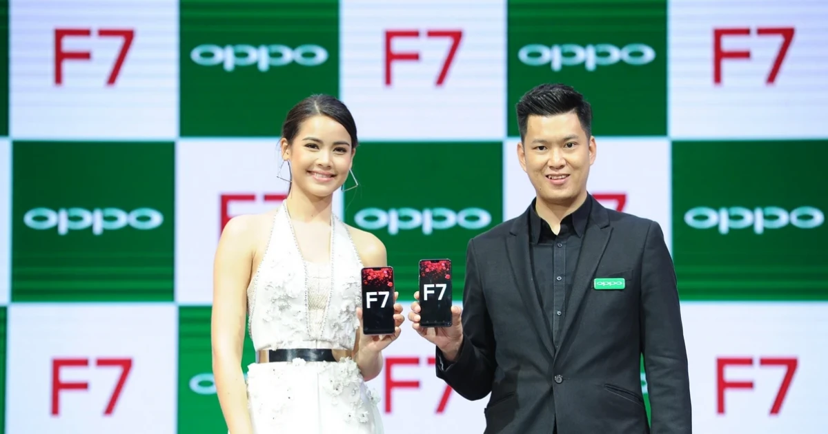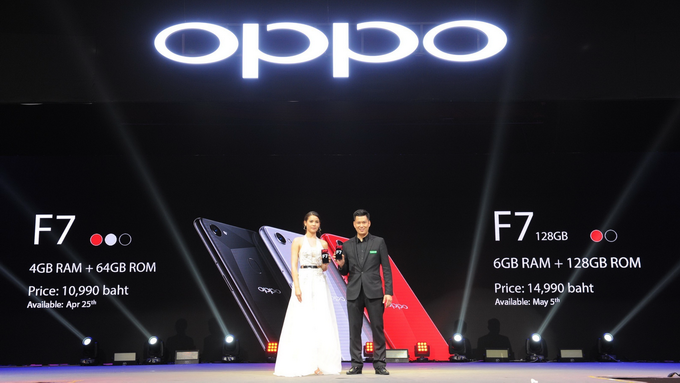 - OPPO F7, RAM 4GB, ROM 64GB มีให้เลือก 3 สี ได้แก่ Solar Red, Moonlight Silver และ Diamond Black ราคา 10,990 บาท เริ่มจำหน่ายวันแรกวันที่ 25 เมษายน