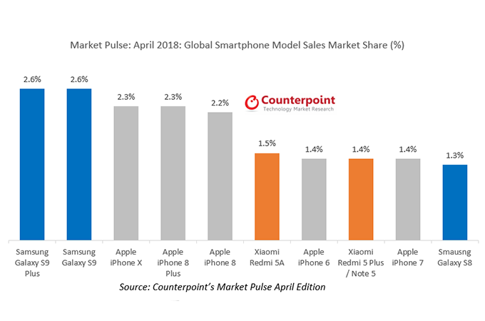 โดยจากผลสำรวจของ Counterpoint พบว่า จากยอดขายที่เพิ่มขึ้นในโซนเอเชียแปซิฟิคและอเมริกาเหนือของ Samsung Galaxy S9+ และ Galaxy S9 ส่งผลให้ทั้งสองรุ่นสามารถกินส่วนแบ่งทางการตลาดไปได้ 2.6% ขึ้นเป็นอันดับ 1 และ 2 ตามลำดับในขณะที่ iPhone x และ iPhone 8 Plus ของ Apple ทำส่วนแบ่งทางการตลาดไปได้ 2.3% ตามมาเป็นอันดับ 3 ร่วมกัน