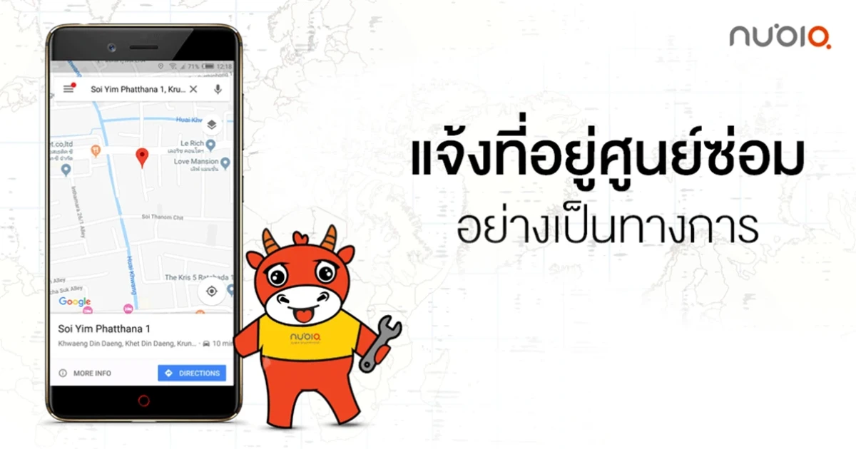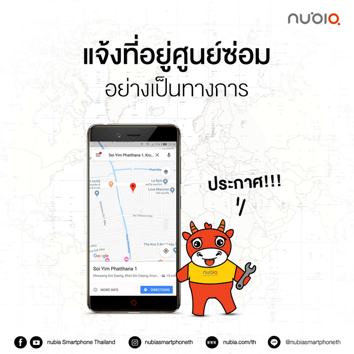 Nubia Smartphone ประกาศแจ้งศูนย์บริการของนูเบียอย่างเป็นทางการ ลูกค้าที่พบปัญหาสามารถนำเครื่องไปแจ้งซ่อมได้ที่ บริษัท ไท่ อี้ อินเตอร์เนชั่นแนล (ไทยแลนด์) จำกัด ที่อยู่ 1084 ซอยยิ้มพัฒนา 1 ชั้น 2 ถนนสุทธิสารวินิจฉัย แขวงดินแดง เขตดินแดง กรุงเทพมหานคร 10400