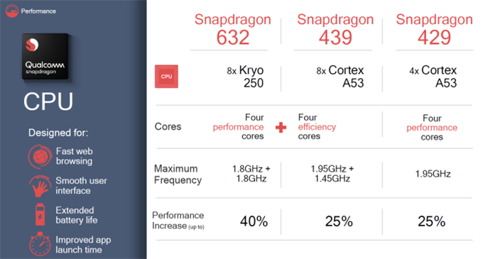 สำหรับ CPU Snapdragon 439 และ Snapdragon 429 เป็นรุ่นอัพเกรดจาก 425 และ 430 ในปัจจุบัน โดยมีการปรับปรุงเรื่องของการประหยัดพลังงานให้ดีขึ้น 25% และในรุ่น 439 จะรองรับหน้าจอแสดงผลระดับ FullHD รวมถึงสนับสนุนการใช้งานร่วมกับเซ็นเซอร์กล้องถ่ายรูปแบบ Dual cam ที่ความละเอียดระดับ 21 + 8 ล้านพิกเซล