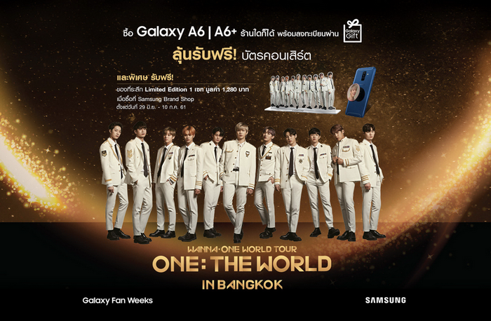 ซัมซุง เตรียมมอบโปรโมชั่นสุดเซอร์ไพร์ส แก่วอนนาเบิลชาวไทยหรือผู้ที่สนใจ เมื่อซื้อสมาร์ทโฟน Samsung Galaxy A6 หรือ Samsung Galaxy A6+ วันนี้! ลุ้นรับสิทธิ์สุดพิเศษในการร่วมเป็นส่วนหนึ่งของคอนเสิร์ตครั้งประวัติศาสตร์ "Wanna One World Tour ONE: The WORLD IN BANGKOK" จำนวนจำกัดเพียง 300 ที่นั่ง (ที่นั่งละ 7,500 บาท)