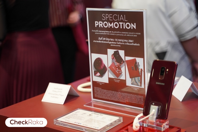 พบกับ โปรโมชั่นลิมิตเต็ดเอดิชั่นสุดพิเศษพร้อมเป็นเจ้าของก่อนใคร! เมื่อซื้อ Samsung Galaxy S9+ สีใหม่ Burgundy Red ในงาน "Samsung X Vogue Present Burgundy Red Lounge in partnership with Absolute Siam" ณ ลานเอเทรียม ชั้น 1 สยามเซ็นเตอร์ รับฟรีทันที! แฟชั่นไอเท็มลิมิตเต็ดซึ่งได้รับการออกแบบจากแบรนด์ดีไซน์เนอร์ไทยชื่อดังระดับแถวหน้า ที่ได้รับแรงบันดาลใจมาจากสี Burgundy Red โดยผู้ซื้อสามารถเลือกรับแฟชั่นไอเท็มลิมิตเต็ดอย่างใดอย่างหนึ่งระหว่าง