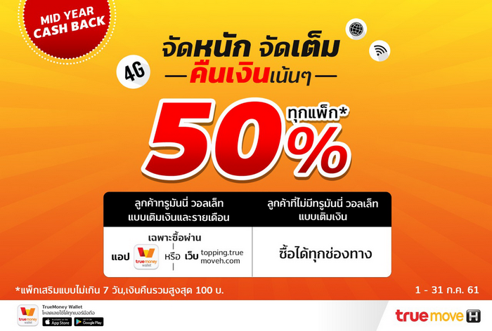 ชี้เป้า! สมัครแพ็กเสริม TrueMove H รับเงินคืนทันที 50% เข้าบัญชี TrueMoney Wallet