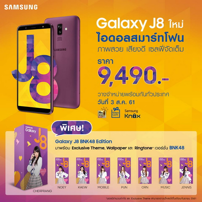 สำหรับในประเทศไทยวางจำหน่ายในราคา 9,490 บาท พอๆกับในต่างประเทศเลย และมาพร้อมเวอร์ชั่นพิเศษ Galaxy J8 BNK48 Edtion ราคา 12,900 บาท มีจำนวนจำกัดเพียง 20,000 ชุดเท่านั้น มาพร้อม Exclusive Theme, Wallpaper และ Ringtone วางจำหน่ายพร้อมกัน 3 ส.ค. 61