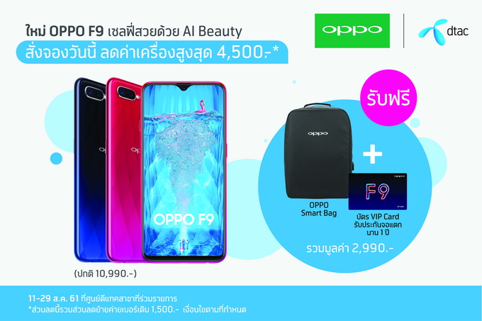 พิเศษสำหรับลูกค้าที่จอง OPPO F9 ตั้งแต่วันที่ 11 -24 สิงหาคม 2561 รับของสมนาคุณจาก OPPO ได้แก่ OPPO Smart Bag และบัตร VIP CARD รับประกันจอแตกนาน 1 ปี