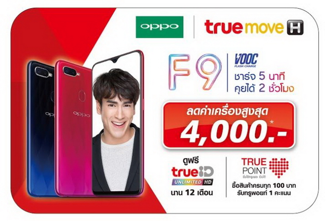 AIS, TrueMove H และ dtac จับมือกับ ออปโป้ ประเทศไทย เปิดตัว OPPO F9 สมาร์ทโฟนที่มาพร้อม 3 สีไล่เฉดสวย ได้แก่ สีแดง (Sunrise Red), สีน้ำเงิน(Twilight Blue) และ สีม่วง (Starry Purple) พร้อมด้วยลวดลายกลีบดอกไม้และเฉดสีที่เปลี่ยนไปตามมุมมอง เต็มตาด้วยขนาดหน้าจอแสดงผล Waterdrop Screen FHD+ 6.3 นิ้ว ในด้วยอัตราส่วน 19.5 : 9 ให้สัดส่วนพื้นที่แสดงผลสูงถึง 90.8% และเป็นครั้งแรกในสมาร์ทโฟนซีรีย์ F ประสิทธิภาพการถ่ายภาพเต็มเปรี่ยมด้วยกล้องหลังคู่ 16MP + 2MP และกล้องหน้าความละเอียด 25MP พร้อม AI Beauty 2.1 ผ่านการวิเคราะห์ใบหน้าด้วย 296 จุด ให้สามารถถ่ายภาพเซลฟี่ให้ออกมาสวยดั่งใจ