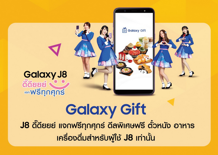 Samsung Galaxy J8 ไอดอลสมาร์ทโฟนจาก ซัมซุง มอบสิทธิสุดพิเศษผ่านแอปพลิเคชั่น Galaxy Gift รวบรวมโปรโมชั่นและดีลเด็ดๆ จากร้านค้าที่ร่วมรายการ ทั้งส่วนลด ดีลพิเศษ และของแถมในหลากหลายรูปแบบ เพื่อตอบโจทย์ด้านไลฟ์สไตล์ของกลุ่มคนในเจนเนอเรชั่นวาย โดยครั้งนี้ซัมซุงส่งโปรสุดพิเศษเอาใจเหล่าลูกค้าที่ใช้ Samsung Galaxy J8 ไอดอลสมาร์ทโฟน สามารถแลกรับสิทธิ์แบบจัดเต็มทั้งความอิ่มอร่อยและความบันเทิงฟรีทุกๆวันศุกร์ โดยสิทธิพิเศษมีดังต่อไปนี้
