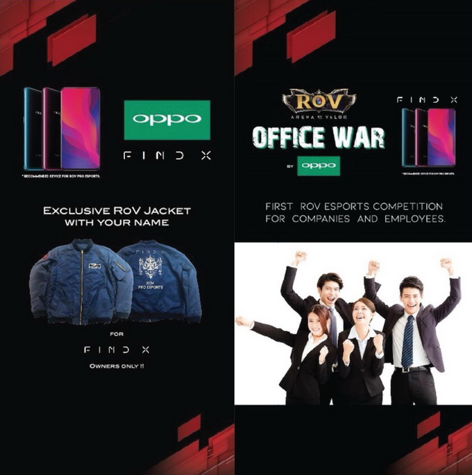 นอกจาก OPPO จะเข้าร่วมเป็นพันธมิตรในการจัดการแข่งขันครั้งนี้อย่างเป็นทางการแล้ว พิเศษ! เฉพาะสำหรับผู้ที่เป็นเจ้าของ OPPO Find X เท่านั้น จะได้รับเสื้อแจ็คเกต ROV ซึ่งปักชื่อเจ้าของไว้ด้วยอย่าง Exclusive สุดๆ โดยจะมีจำนวนจำกัด สำหรับพนักงานออฟฟิศที่สนใจรวมทีมเข้าแข่งขัน ROV Office War by OPPO และผู้ที่เป็นเจ้าของ OPPO Find X ที่รอรับเสื้อแจ็คเกต ROV